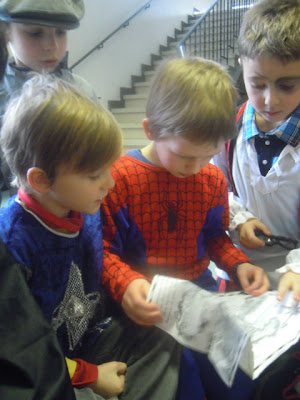 Namiddag speelden we een piratenspel, dat Kristie samen met haar klas, voor ons gemaakt had. We moesten in totaal 6 doosjes in het schoolgebouw zoeken: in de trappenhal, in het leraarslokaal, in de speelzaal,... In elke doosje zat er een raadseltje, dat we konden oplossen met de hulp van het boek van Jef. Als we het raadseltje goed oplosten, kregen we een letter en een tip waar het volgende doosje verstopt was. Uiteindelijk hadden we 6 letters ( G I N D I R ) die ons vertelden waar de schat verstopt zat. Na wat zoekwerk zag Sigi ineens de juiste oplossing: INGRID.... de schat was verstopt in de klas van Ingrid. Onder haar praatrondebank stond een grote schatkist met een slot. Thijs droeg de zware kist naar het klasje van Kristie, waar we samen met de kleuters de kist open maakten en konden smullen van een lekker snoepje. Dank je wel, Kristie en flinke piraten, voor het spel: we hebben er echt van genoten!