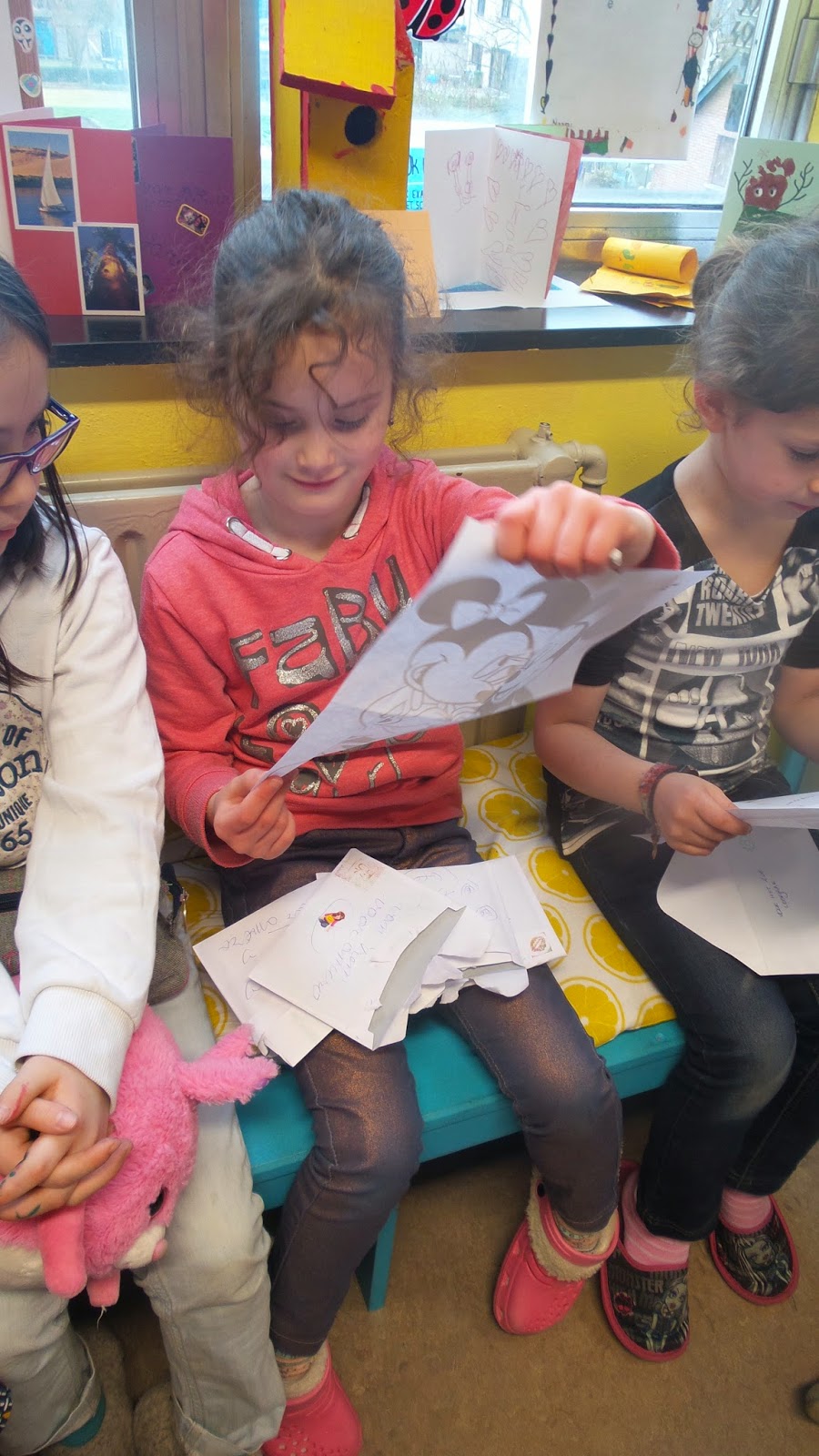 Nadat we alle leuke brieven en kaartjes voorgelezen en bewonderd hadden, luisterden we graag nog even naar het verhaal ' Sarie vindt een brief '.