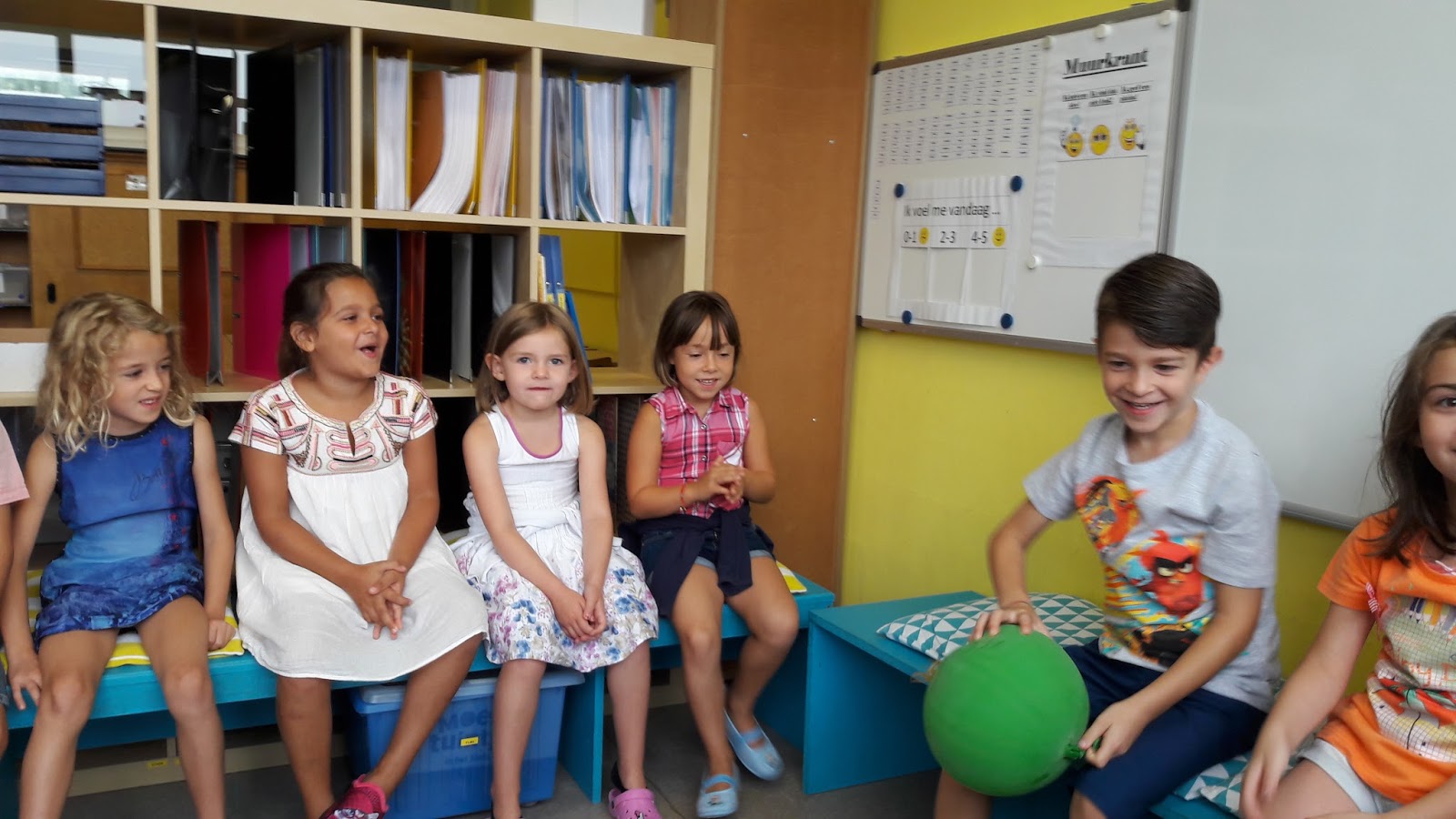 Toen de boekentassen, de kaften, de boterhamdozen, de pennenzakken, ... allemaal een plaatsje hadden gekregen speelden we in onze praatronde leuke kennismakingsspelletjes met een ballon, een dobbelsteen met vraagjes en naamkaartjes.